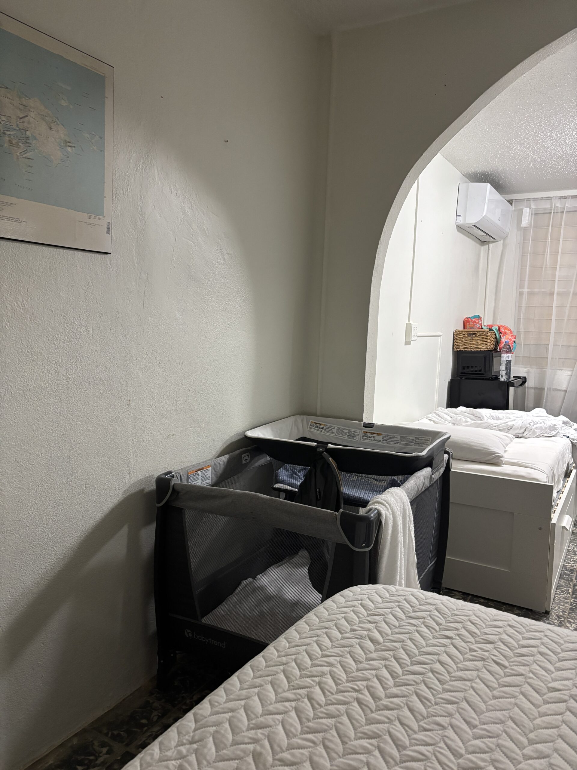 ベビーベッドはありませんが、ソファベッドに少し壁がついていたので、添い寝もすれば落ちる心配なく寝られました。